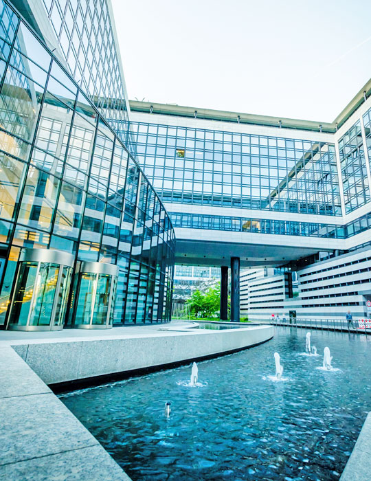 „Green Building“. Das 11-stöckige Gebäude umfasst zwei Kubus-förmige Baukörper mit einer Gesamtfläche