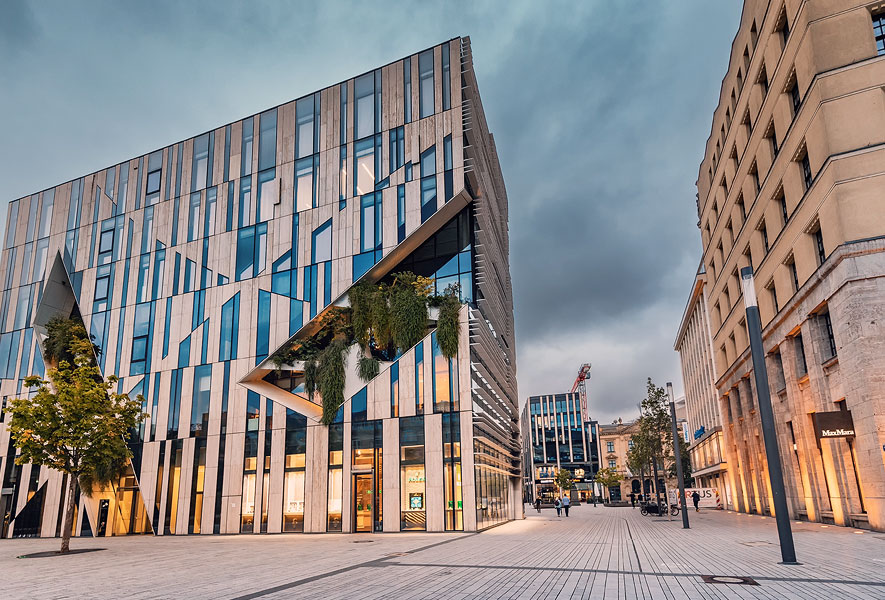 Mit der Einkaufsmeile und dem Büroturm im „Kö-Bogen“ hat sich die Metropole Düsseldorf ein neues Aushängeschild zugelegt. Herzstück ist der spektakuläre Neubau von Stararchitekt Daniel Libeskind. Die prägnante Fassade